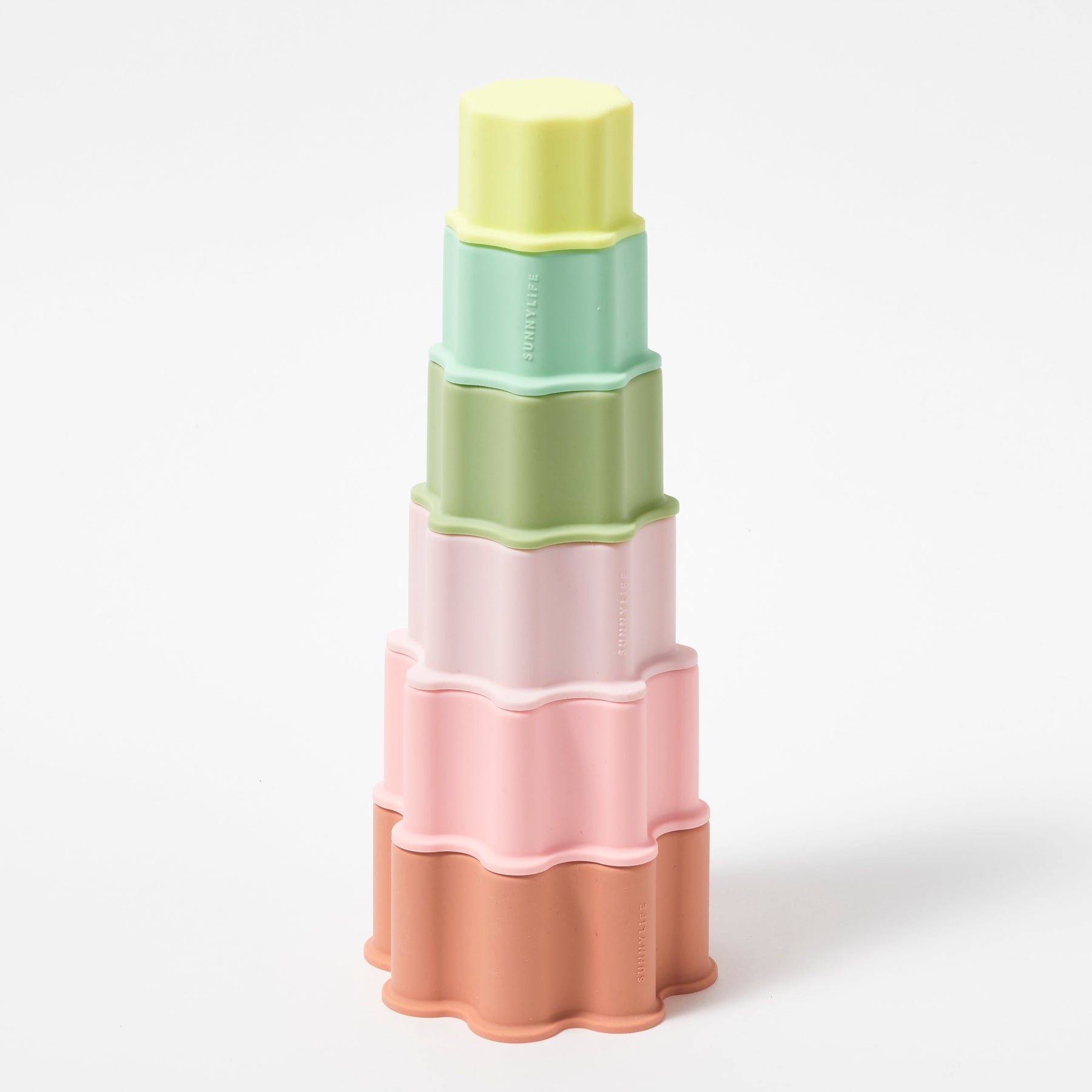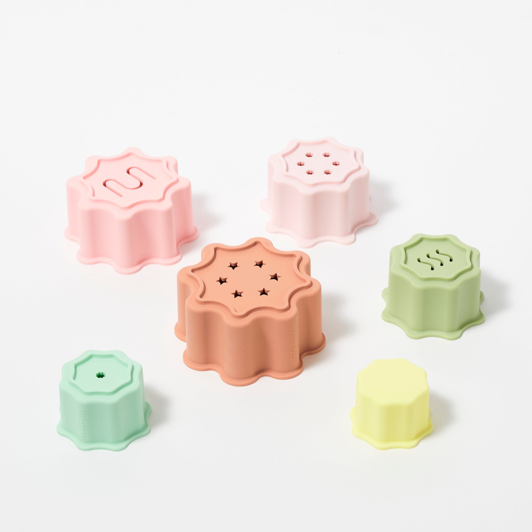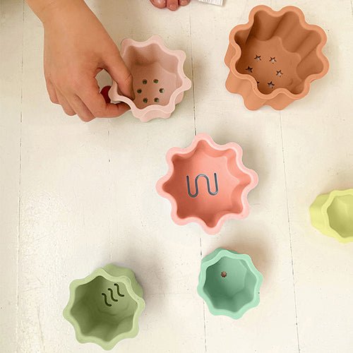 Šis silikoninių kaladėlių rinkinys tinkamas žaidimams prie jūros, vonioje ar bet kur kitur. Kaladėles galima statyti viena ant kitos ar naudoti kaip smėlio žaislus. Dėl skylučių dugne vanduo ar smėlis lengvai pasišalina, jas lengva plauti. Skatinkite savo mažylių kūrybiškumą ir vaizduotės žaidimus vandenyje!